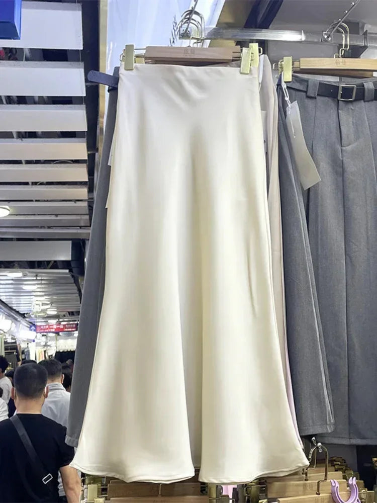Elegant Women‘s Skirts High Waist Satin Silk Long Skirt Office Ladies Korean Fashion Solid Champagne Fishtail A-line Skirt Women